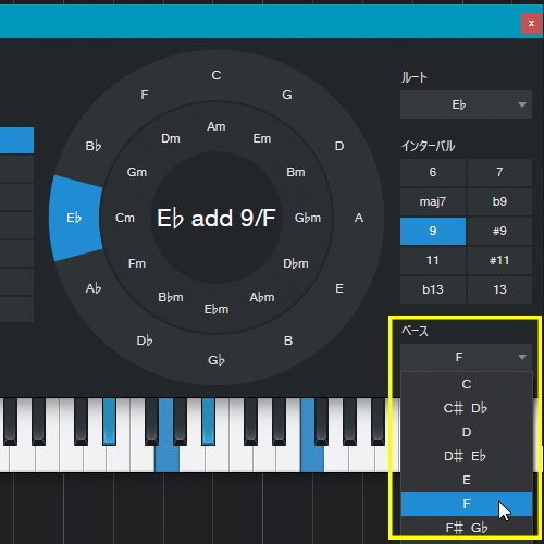 ベースの値を変更すると、ベース音を変更(分数コード)できます。